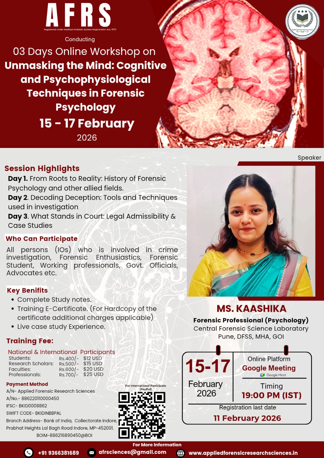 This workshop is designed to provide participants with a comprehensive understanding of forensic psychology and the role of cognitive and psychophysiological techniques in criminal investigation and legal proceedings. The program focuses on how psychological principles are applied to deception detection, behavioral analysis, and courtroom admissibility, supported by real case discussions and practical insights.